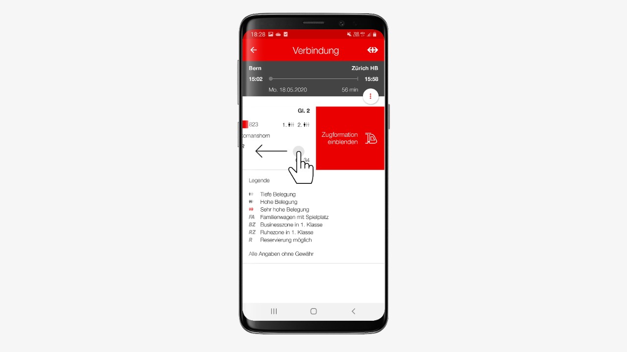 Die Zugformation wird nach dem Wischen eingeblendet.