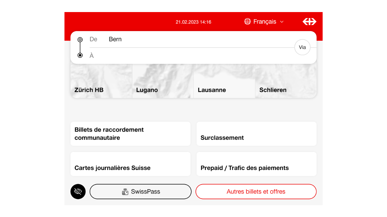 L’achat de billets, comme dans Mobile CFF et sur CFF.ch, s’effectue en premier lieu par la sélection de l’horaire.